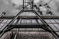 Industrieel metalen bouwwerk, tegen een oude gevel, bij een verlaten fabriek in Nederland.