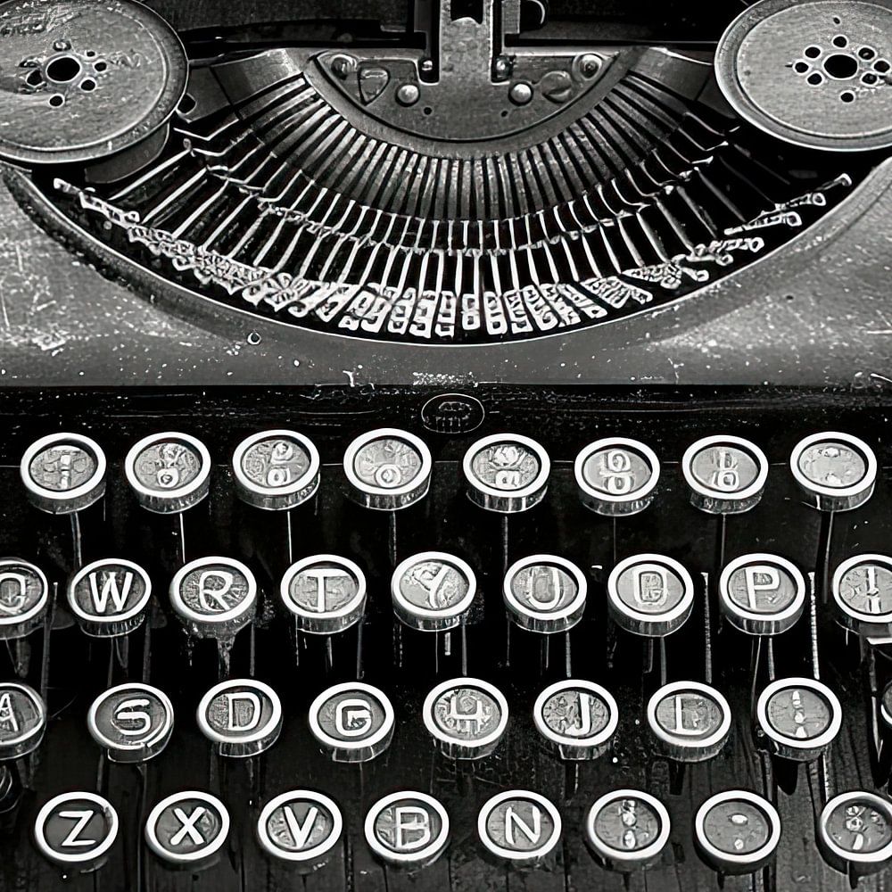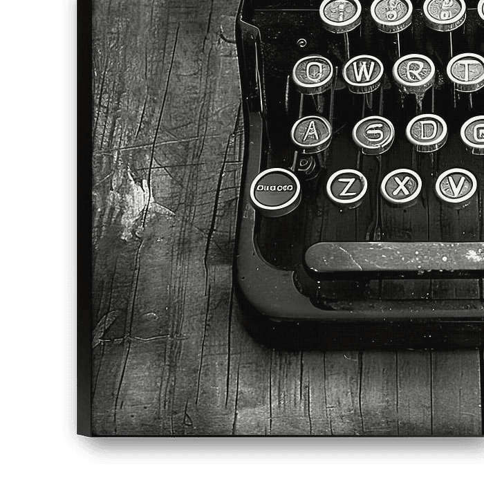 Deze muurdecoratie toont een oude typemachine in een gedetailleerde zwart-wit compositie. Het beeld wat een gevoel van nostalgie op.