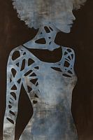 Industriële Vrouw - Dit vrouwen schilderij toont een elegante, industrieel aandoende vrouwelijke figuur met een abstract patroon van uitsnijdingen, van wie de aanwezigheid wordt versterkt door haar contrastrijke, blauwe en roestbruine tinten op een donkere achtergrond.