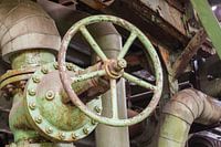 Verroeste en afgebladderde industriele afsluiter in een verlaten fabriek
