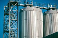 Industriële opslagtanks close-up die een abstract lijnenspel en vorm creëren.