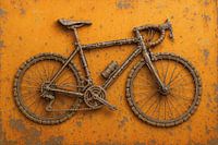 Dit kunstwerk toont een racefiets die volledig lijkt te zijn opgebouwd uit roestige metalen onderdelen. Bij een eerste blik zie je duidelijk het fietsframe en de wielen, maar wie langer kijkt ontdekt talloze kleine details: oude fietskettingen die perfect in de velgen verwerkt zijn, tandwielen die de crank vormen, boutjes en moertjes…