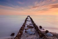 De palen van Hindeloopen in pastelkleuren. Oneindig beeld tot de horizon bij het Ijselmeer.