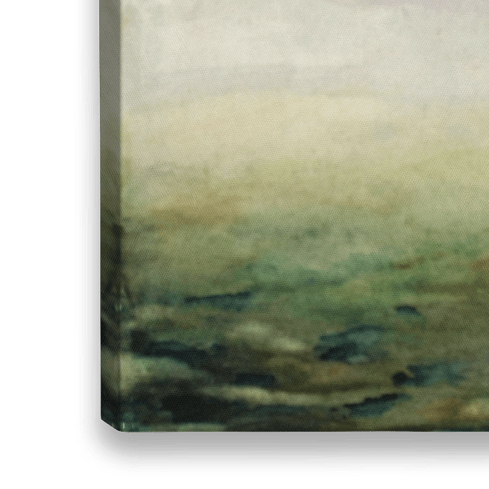 Aquarel van een oneindig figuratief landschap . Mysterieus. De kleuren van de lucht en het land lopen in een mist in elkaar over en wordt het een oneindig landschap, waar begint of eindigt het ? Ook erg mooi als behang voor de hal.