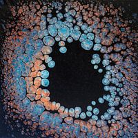 Oneindigheid. Een abstract, minimalistisch beeld dat doet mijmeren over de oneindigheid van ons heelal. Een rustig beeld met zeggingskracht uitgevoerd in de Fluid Art verftechniek in kleuren als blauw, zwart en koper.