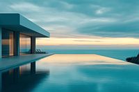 Een sfeervolle foto van een moderne villa met infinity pool straalt rust en minimalisme uit. Een tijdloos tafereel dat luxe, ontspanning en zomerse sereniteit oproept.