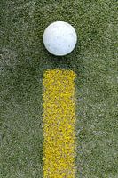 Abstract, belijning van het hockey kunstgras-zandveld met een hockey bal vormen de letter i-symbool van informatie.