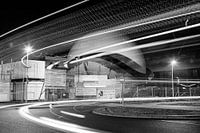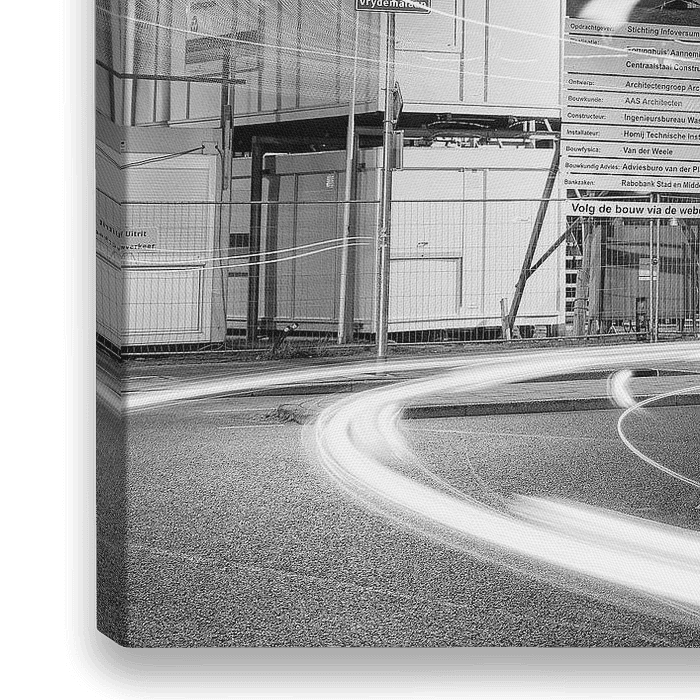 Het Infoversum, nu DOT, in de stad Groningen, in aanbouw. De lichtstrepen komen van een voorbij rijdende bus. Deze foto is gemaakt in het najaar van 2013. Zwart-Wit uitvoering
