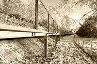 Infraroodfoto geconverteerd naar sepia van de fietsbrug "De Lange Wapper" in Zoutleeuw, België. De foto is bij het begin van de herfst in 2020 gemaakt.