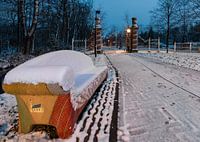 Ingang met bank van het landgoed Nienoord te Leek net voor zonsopkomst, tijdens het blauwe uur. De verlichting is aan en er ligt sneeuw.