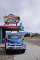 De ingang van Mr. D'z diner in de stad Kingman, Arizona, USA. Met een oude bestelwagen voor het diner geeft het echt een goed beeld van vervlogen tijden. Het diner is nog steeds open en serveert een verscheidenheid aan eten, waaronder hamburgers en friet.