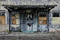 Voorgevel van een een oud verlaten gebouw op een locatie in Duitsland. Het grunge effect geeft een mysterieuze sfeer aan de foto.