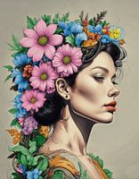 Ai bewerking van een vrouw met ingekleurde bloemen als hoofdtooi