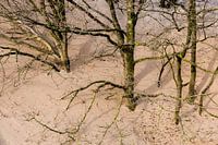 Door het bewegende zand zijn veel bomen ingestuifd. Het is begonnen met een klein heuveltje dat uitgroeide tot een duin van enkele meters hoog. Op de top van de duin sta je dan naast de kruin van de boom. Deze foto is gemaakt de dag na een flinke storm. Een nieuwe laag zand bedekt de gevallen bladeren op de grond. Het duurt niet lang of…