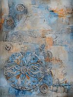 De afbeelding toont een kunstwerk dat een abstracte of gemengde mediacompositie lijkt te zijn. Het bevat een verscheidenheid aan texturen, patronen en vormen in tinten blauw, oranje en bruin, met enkele witte gebieden die papier of stof suggereren. Er zijn verschillende cirkelvormige elementen, waaronder wat lijkt op een decoratieve metalen plaat met ingewikkelde ontwerpen in het midden. De achtergrond is enigszins chaotisch, met overlappende lagen en een gevoel van diepte gecreëerd door het samenspel van kleuren en vormen. De algehele stijl suggereert een expressionistische of postimpressionistische invloed, waarbij de nadruk op kleur en textuur belangrijker is dan realistische weergave.