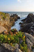 Inham aan de kust van de Atlantische Oceaan in de Loire-Atlantique (de zogenaamde "cote sauvage"), met groene begroeiing op de voorgrond. Het avondlicht kleurt de stenen mooi goudgeel.
