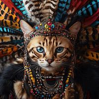 Het inheemse kat krijger schilderij is een krachtig en intrigerend kunstwerk dat de mystiek van inheemse culturen combineert met de sierlijke, trotse uitstraling van een kat. Deze unieke print toont een katachtige krijger, compleet met traditionele versieringen, hoofdtooi en symbolische elementen die verwijzen naar eeuwenoude rituelen en verbondenheid met de natuur. De intense blik van de kat straalt wijsheid, kracht en bescherming uit – perfect voor wie zijn interieur wil verrijken met betekenisvolle kunst.