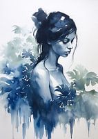 Laat je betoveren door dit intrigerende waterverfportret van een vrouw, omringd door mystieke jungle-elementen. De weelderige blauwe bladeren vormen een achtergrond die een sfeer van mysterie en verwondering oproept. In de stijl van ink wash schilderijen en geïnspireerd door het concept van "mote kei", straalt dit kunstwerk een moody…