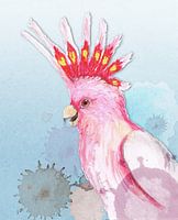 Een wilde aquarel tekening van een Inka-kaketoe. Zijn kuif staat rechtop en zijn snavel staat open. Pas op! Zacht blauwe achtergrond met drippings. Wilde grunge style met zachte kleuren.