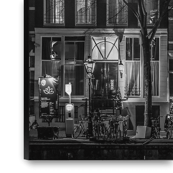 De openheid van veel Amsterdammers wordt mooi geïllustreerd met dit beeld. 's Avonds rond een uur of elf eind oktober zijn veel gordijnen nog niet gesloten en zien we mensen binnen met hun bezigheden. De verlichting buiten geeft de foto een aparte sfeer en laat de prachtige grachtenpanden goed uitkomen. Fietsen en auto's maken het…