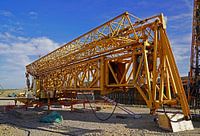 Vouwkraanmontage in Benkendorf op een brugbouwplaats voor de flyover van een landbouwweg over de toekomstige snelweg A143.
