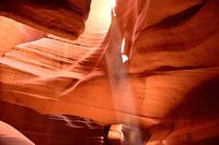 Een geweldige lichtstraal in de Upper Antelope Canyon bij de stad Page in Arizona, VS. Ik had uren in deze canyon kunnen doorbrengen als we de tijd hadden gehad. Helaas duwde de gids ons steeds vooruit om het tijdschema aan te houden, omdat er nieuwe groepen na ons kwamen.
