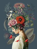 Een vrouwelijk portret waarin bloemen en vogels samenkomen in een rustige, gelaagde compositie.