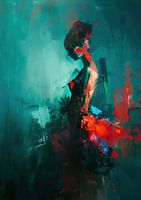 Inner Struggle Unleashed - Dit abstracte schilderij vangt de essentie van chaos en emotie met een dynamische compositie van vegen, druppels en brede penseelstreken. Centraal in het beeld lijkt een menselijke figuur te ontstaan, opgebouwd uit ongestructureerde, haastige penseelstreken in een palet van voornamelijk turkoois, diepblauw en hints van zwart. Deze figuur wordt doorbroken door gedurfde accenten van rood, oranje en een beetje wit, die levendigheid en beweging suggereren. Deze elementen lijken haast explosief vanuit het centrum van de figuur te komen, wat een gevoel van innerlijke strijd of ontplooiing kan symboliseren. Het kleurgebruik is intens en de manier waarop de kleuren over het doek lijken te dansen, draagt bij aan het overweldigende gevoel van een persoonlijke, emotionele uitbarsting.
