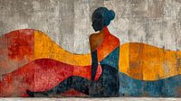 De vrouw is in profiel weergegeven met een rustige en peinzende uitstraling. De achtergrond is opgebouwd uit krachtige, maar harmonieus op elkaar afgestemde…