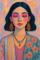 Met gesloten ogen en een serene uitdrukking straalt deze vrouw kalmte uit, omringd door levendige kleuren en florale patronen. De warme pasteltinten, sieraden en schilderachtige stijl maken dit portret tot een harmonieus en expressief kunstwerk.