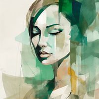 serene en abstracte interpretatie van een vrouwelijk portret. De vrouw is weergegeven met gesloten ogen en een kalme expressie, wat een gevoel van introspectie en innerlijke rust uitstraalt. Het gebruik van geometrische en transparante vlakken in tinten groen, wit, beige en subtiel oranje creëert een gelaagde en dynamische compositie. De kleuren overlappen elkaar op een manier die beweging suggereert, maar de rust in de gezichtsuitdrukking vormt het ankerpunt van het werk.