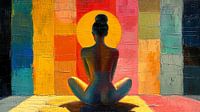 Dit rustgevende, krachtige kunstwerk toont een vrouwelijke figuur in een lotushouding, centraal geplaatst tegen een achtergrond van geometrische kleurblokken.