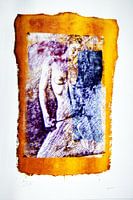 "Innerlijke Stilte" is een poëtisch portret waarin de kwetsbaarheid van het menselijk lichaam versmelt met een gelaagde grafische structuur. Deze zeefdruk combineert verfijnde lijnvoering met fotografische textuur, waarbij de contouren van een vrouwelijke figuur als het ware opduiken uit een dans van licht en schaduw. De warme, roestige omlijsting benadrukt de fragiliteit en zachtheid van de centrale figuur, die in introspectie verzonken lijkt.