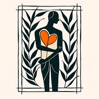 De afbeelding toont een abstracte kunstprint waarbij de contouren van een mensfiguur centraal staan. De figuur lijkt vanaf de zijkant te zijn weergegeven, met een minimalistische maar toch vloeiende en gestileerde lijntekening. Opvallend is het grote, rode hart in het centrum van de figuur, dat gesplitst is in…