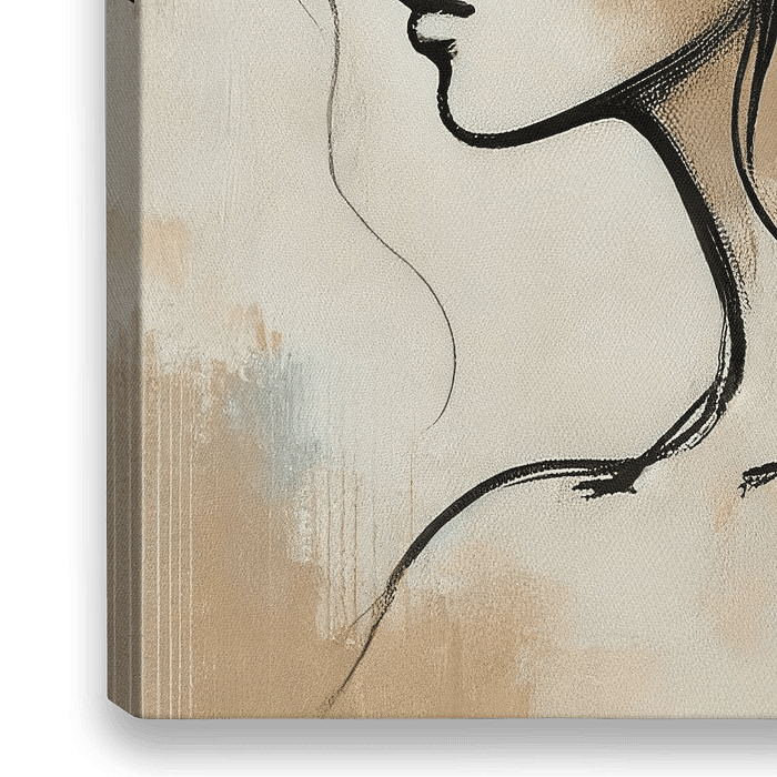 Innerlijke Rust is een betoverend modern schilderij dat de subtiele kracht en sereniteit van de vrouwelijke vorm vangt. Dit kunstwerk toont een zijprofiel van een vrouw met gesloten ogen, haar gelaatstrekken zacht en vredig, alsof ze in diepe meditatie of dromen verzonken is. De delicate lijnen die haar contouren schetsen, zijn dun en…