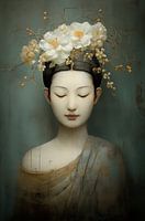 Een portret van een vrouw met bloemen rond haar hoofd, uitgewerkt in zachte tinten en fijne details. De ontspannen houding en gesloten ogen geven het werk een gevoel van rust en bezinning. Een kunstwerk dat zorgt voor een rustige sfeer en een subtiele blikvanger in huis is.