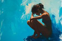 Een eenzaam silhouet verbergt zich in een zee van zachtblauwe horizonten, pauzerend in een peinzende houding. De krachtige penseelstreken creëren een emotionele diepte, terwijl het spel van licht en schaduw de droefheid en kwetsbaarheid van het moment vastlegt. Innerlijke onrust en de rustgevende uitgestrektheid van de ruimte smelten…