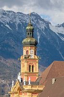 De kerktoren van de abdij van Wilten - gefotografeerd tegen de achtergrond van het Nordkette-gebergte.