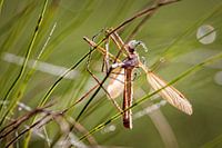 Insect in het gras bedekt met waterdruppels van de ochtenddauw in het tegenlicht.