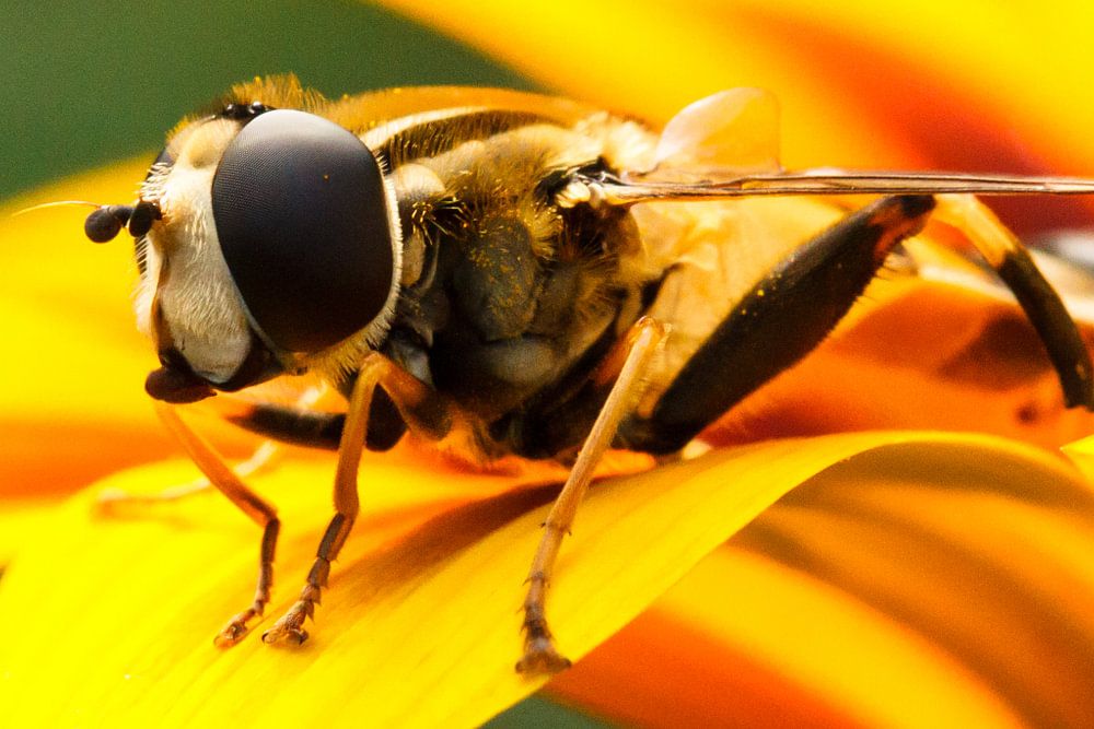 Een macrofoto van een insect op een oranje-gele bloem.