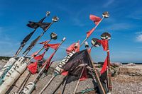 An der Steinmole im Hafen von Vitt stehen Bojen mit roten und schwarzen Fahnen, Fischerdorf Vitt, Gemeinde Putgarten, Halbinsel Wittow, Insel Rügen, Landkreis Vorpommern-Rügen, Mecklenburg-Vorpommern, Deutschland, Europa