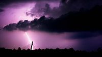 Een bliksemontlading tussen Utrecht en Nieuwegein in. De bliksem ontlaadt zich boven de wolk met wat uitlopers buiten het zicht, en loopt dan naar beneden naar een inslagpunt, ergens tussen Utrecht en Nieuwegein. Ik maakte deze foto vanaf mijn balkon in Utrecht. Vanuit dit perspectief is de inslag 'achter' de toren van de Prins…
