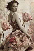 Mixed media afbeelding van een mooie vrouw in zwartwit op een achtergrond met roze tulpen, in volle glorie en onderin een uitgebloeide tulp voor een speciaal effect uitlopend in haar mooie jurk in dezelfde kleurstelling van roze, beige en bruin. De tulp als typisch Nederlandse bloem, verwerkt in fashion en mode. Passend bij diverse stijlen en trends. Nostalgisch, lente, zomer, pastelkleuren. Artist: Bianca ter Riet