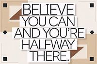 Dit ontwerp combineert inspirerende woorden met een minimalistisch en modern design. Het zwart-witte kleurenschema met geometrische vormen zorgt voor een stijlvolle uitstraling, die perfect past in verschillende interieurstijlen. Het krachtige citaat, “Believe you can and you're halfway there,” herinnert je eraan dat de juiste mindset essentieel is om je doelen te bereiken. Deze poster is niet alleen een decoratieve toevoeging, maar biedt ook dagelijks een motivatieboost. Het ontwerp is perfect voor ruimtes zoals kantoren of slaapkamers, waar focus en inspiratie vaak gewenst zijn. Een tijdloze en stijlvolle keuze voor iedereen die een combinatie zoekt van eenvoud en motivatie in hun leefruimte.