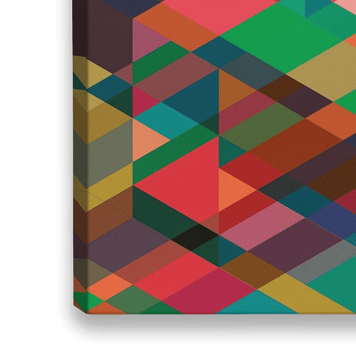 Een levendige, abstracte compositie met overlappende geometrische vormen in verschillende kleuren. De compositie creëert een dynamisch spel van licht en schaduw, waarbij sommige delen transparant zijn, wat een gevoel van diepte en beweging geeft.