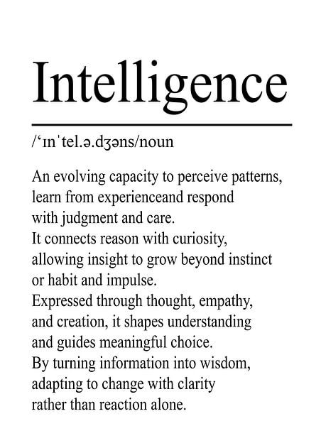 Intelligentie staat voor inzicht, het vermogen om te leren en bewust handelen. Deze typografische poster benadrukt de term helder en rustig en nodigt uit tot nadenken.