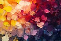 Het kleurenspel van de bladeren is een adembenemend palet van diepe, rijke tinten die de overgang van het seizoen weerspiegelen. Van het warme, zonovergoten geel en oranje aan de randen van de bladeren, die een levendig contrast vormen met de dieproze en vuurrode vlekken die zich als vlammen over het blad verspreiden. De intensiteit van het kleurenpalet neemt af naar het midden, waar paarsachtige en donkergrijze schakeringen zich vermengen, alsof de herfst in al zijn pracht langzaam overgaat in de schaduwen van de winter. Het zwart dat de randen omsluit lijkt bijna een verzegeling van de vergankelijkheid, een stil statement van de vergankelijkheid van de tijd. Het licht dat rechtsbovenin begint, werpt een zachte gloed over de bladeren, waardoor de kleuren zachtjes vervagen en het geheel een mysterieuze, dromerige sfeer krijgt. Het is een spel van licht en schaduw, van warmte en kou, dat de ziel van de herfst vastlegt. Modern Abstract. Rood. Geel. Oranje. Lila. Paars. Roze. Zwart. Beige.