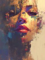 Intens Vrouwenportret met Levendige Kleuren - Dit is een vrouwenportret schilderij met een sterke nadruk op de levendige kleuren en abstracte vormen die de emoties van de vrouw weergeven, waarbij vooral de roze lippen en de intense uitstraling van de ogen opvallen.