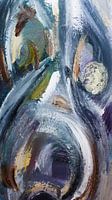 Een veelkleurig acrylverf schilderij waarin veel gebeurd aan kleurschakeringen , menging en penseelbewegingen.