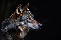Deze prachtige afbeelding toont een wolf in een moment van stille waakzaamheid. De focus ligt op het intense amberkleurige oog dat je aandacht trekt en vasthoudt. Het spel van schaduw en licht laat de textuur van de wolf zijn vacht uitkomen en accentueert de subtiele kleurnuances, van donkerbruin tot zachte grijstinten. De achtergrond, die in mysterieuze duisternis is gehuld, zorgt ervoor dat de wolf als het ware uit het niets lijkt te verschijnen, wat bijdraagt aan de indrukwekkende en krachtige uitstraling van het dier. Deze foto zou niet misstaan als een statement piece in een stijlvolle woonkamer of een inspirerend kantoor.